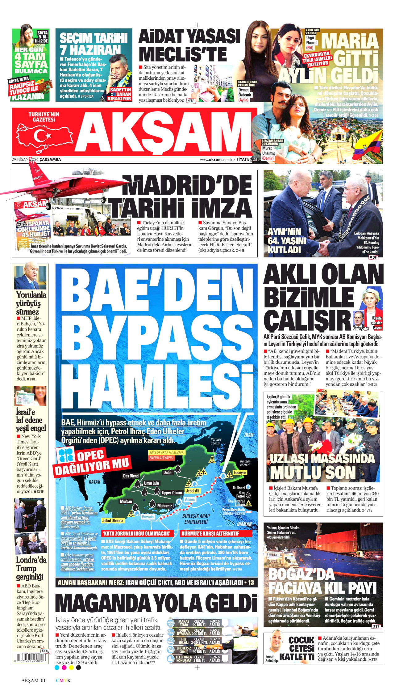 AKŞAM Gazetesi 29 Nisan 2026, Çarşamba Günü Manşeti